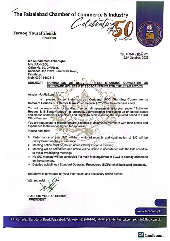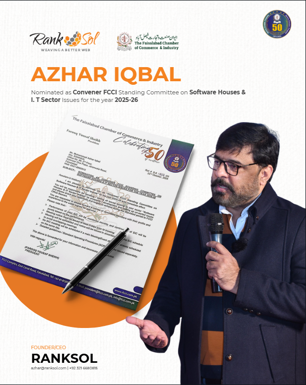 I’m Azhar Iqbal, an entrepreneur with a Master’s in Computer Science (2003). My career began at NADRA (2003-2007), handling national databases, followed by a role at Oman’s Ministry of Manpower, working on one of the country’s largest data systems. These experiences honed my expertise in data management, security, and large-scale system development. In 2009, I co-founded Nimble Web Solutions, laying the foundation for RankSol in 2013, now a leading web solutions company. RankSol is built on innovation, strategic vision, and a commitment to excellence, serving global clients with cutting-edge technology. Our company specializes in scalable, high-performance solutions, empowering businesses to thrive in the digital age. As CEO of RankSol, I drive strategy, operations, and financial management while fostering a strong company culture. I believe in cultivating a work environment that encourages creativity, teamwork, and continuous learning. Beyond business, I contribute to Pakistan’s IT sector as P@SHA Faisalabad Convener and Permanent CEC Member of FITCO, promoting industry collaboration and growth. My active participation in industry forums helps shape policies that drive IT sector expansion and global competitiveness.